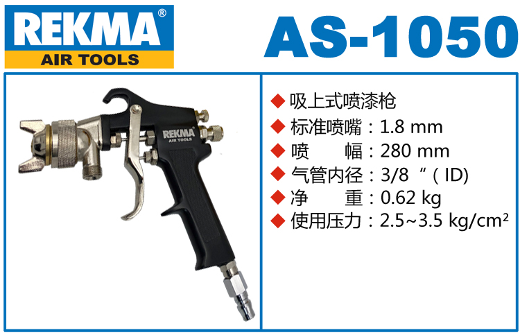銳克馬REKMA AS-1050噴漆槍是利用液體或壓縮空氣迅速釋放作為動(dòng)力的一種設(shè)備。噴槍分為普壓式和加壓式兩種。噴槍還有壓力式噴槍、卡樂式噴槍、自動(dòng)回收式噴槍。